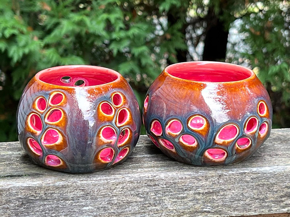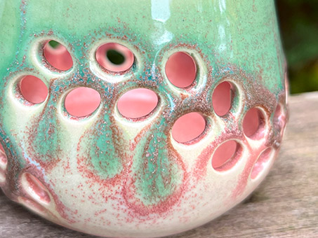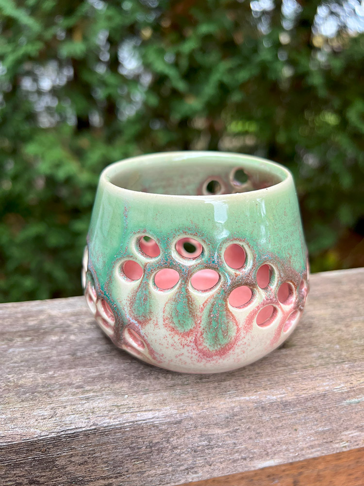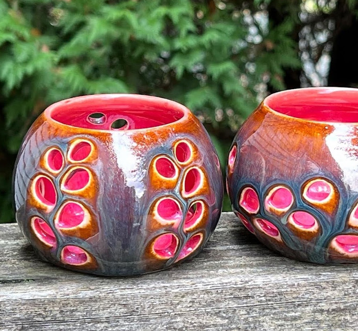 Our Porcelain hearts are impressed with plants or embossed using molds we’ve made with hemlock, spruce and more. They are bisque fired, then painted with underglaze and a clear glaze topcoat and fired again in the kiln. Hearts are either hung from wire-covered paper or beaded using various glass beads and metal birds. No two are alike… Small hearts make great gift tags!